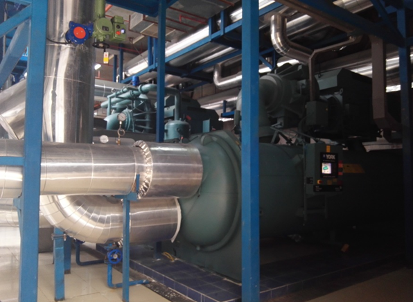 The installed capacity of river water source heat pump system in phase II is 32000kW (refrigeration), including 3 Trane centrifugal main machines, 2 York centrifugal main machines and 8 air conditioning circulating pumps: