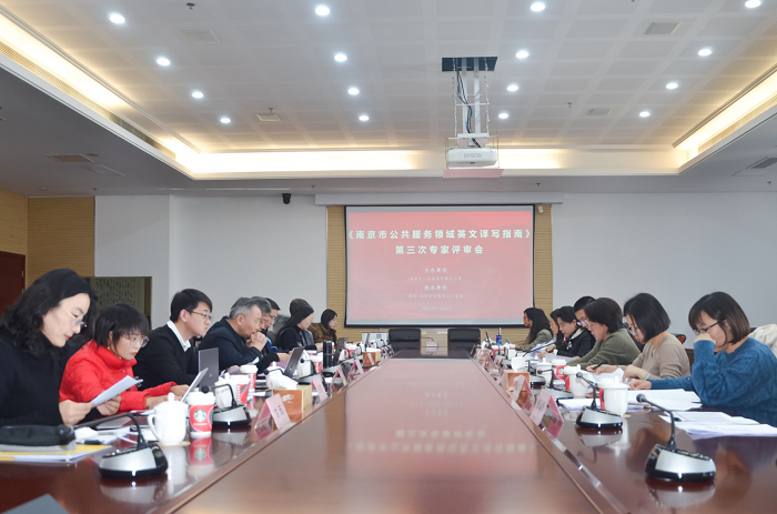 近期,南京市人民政府外事办公室召开《南京市公共服务领域英文译写指南》第三次专家评审会。南京市外办副主任皇甫朝晖主持并致辞,专家组组长、南京大学人文社会科学资深教授王守仁领衔项目专家组成员就《指南》待定词条及各版块译写规范进行研讨,并确定终审意见。